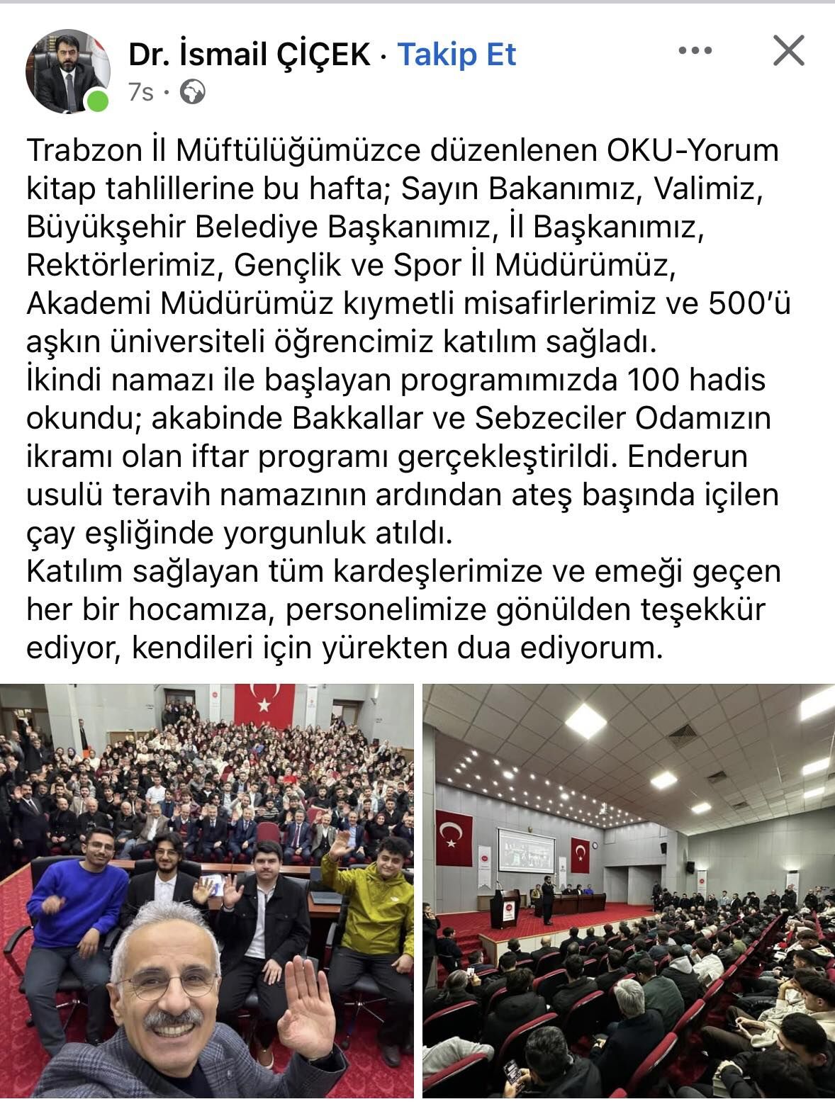 Ulaştırma ve Altyapı Bakanı Abdulkadir Uraloğlu’nun Trabzon ziyaretleri sırasında Vali Tahir Şahin, Trabzon Büyükşehir Belediye Başkanı Ahmet Metin Genç ve AK Parti Trabzon İl Başkanı Sezgin Mumcu, Trabzon İl Müftülüğü tarafından düzenlenen bir programa katıldı. Programın ardından İl Müftüsü İsmail Çiçek’in şahsi sosyal medya hesabından yaptığı, “Trabzon İl Müftülüğümüzce düzenlenen OKU-Yorum kitap tahlillerine bu hafta; Sayın Bakanımız, Valimiz, Büyükşehir Belediye Başkanımız, İl Başkanımız, Rektörlerimiz, Gençlik ve Spor İl Müdürümüz, Akademi Müdürümüz kıymetli misafirlerimiz ve 500’ü aşkın üniversiteli öğrencimiz katılım sağladı.