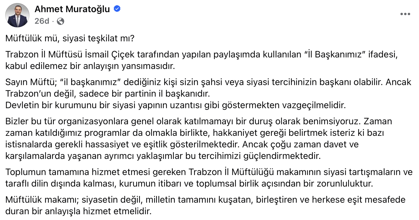 Toplumun tamamına hizmet etmesi gereken Trabzon İl Müftülüğü makamının siyasi tartışmaların ve taraflı dilin dışında kalması, kurumun itibarı ve toplumsal birlik açısından bir zorunluluktur.