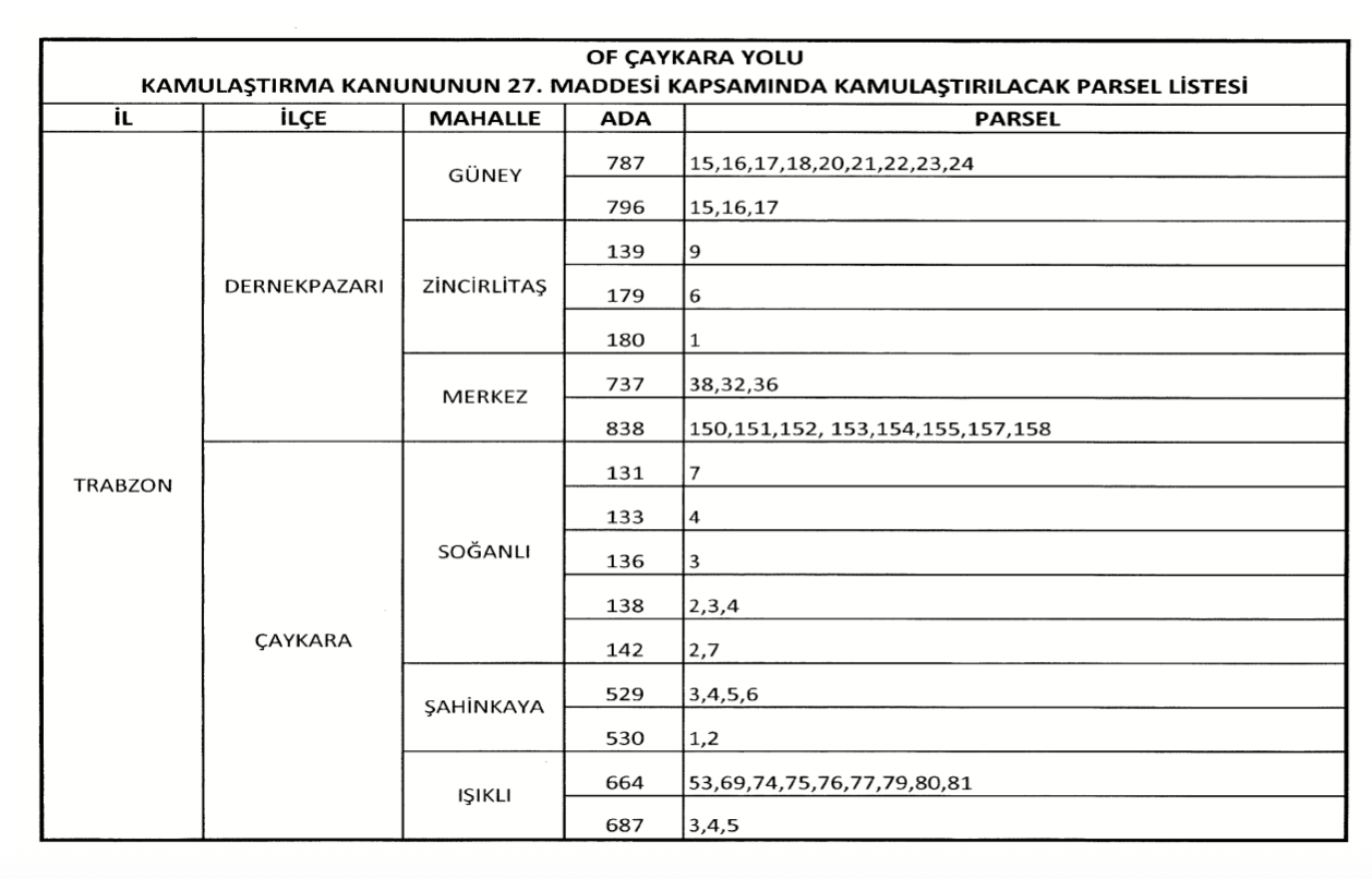 TRABZON'DA KAMULAŞTIRILACAK ALANLAR İSE ŞU ŞEKİLDE: