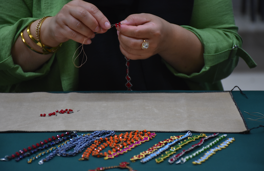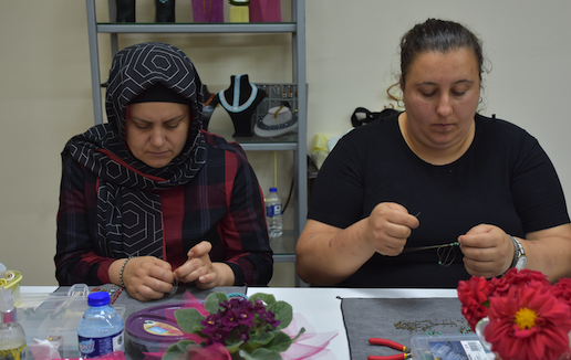 Ayasofya El Sanatları Merkezi'nde düzenlenen meslek eğitim kurslarına katılan 12 özel gereksinimli bireyin annesi, bileklik, kolye ve küpe gibi çeşitli takıların yapımına ilişkin eğitim alıyor.