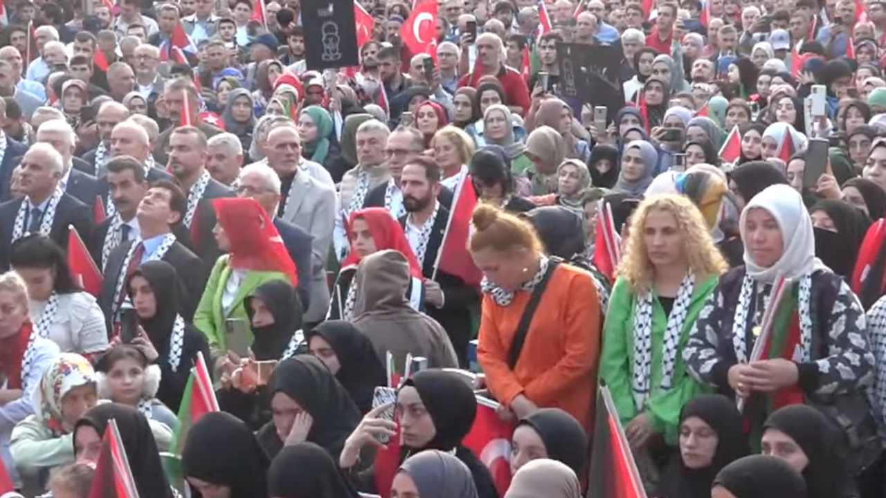 Miting esnasında katılımcılar “Katil İsrail, Filisti’nden defol” şeklinde slogan attıkları görüldü.