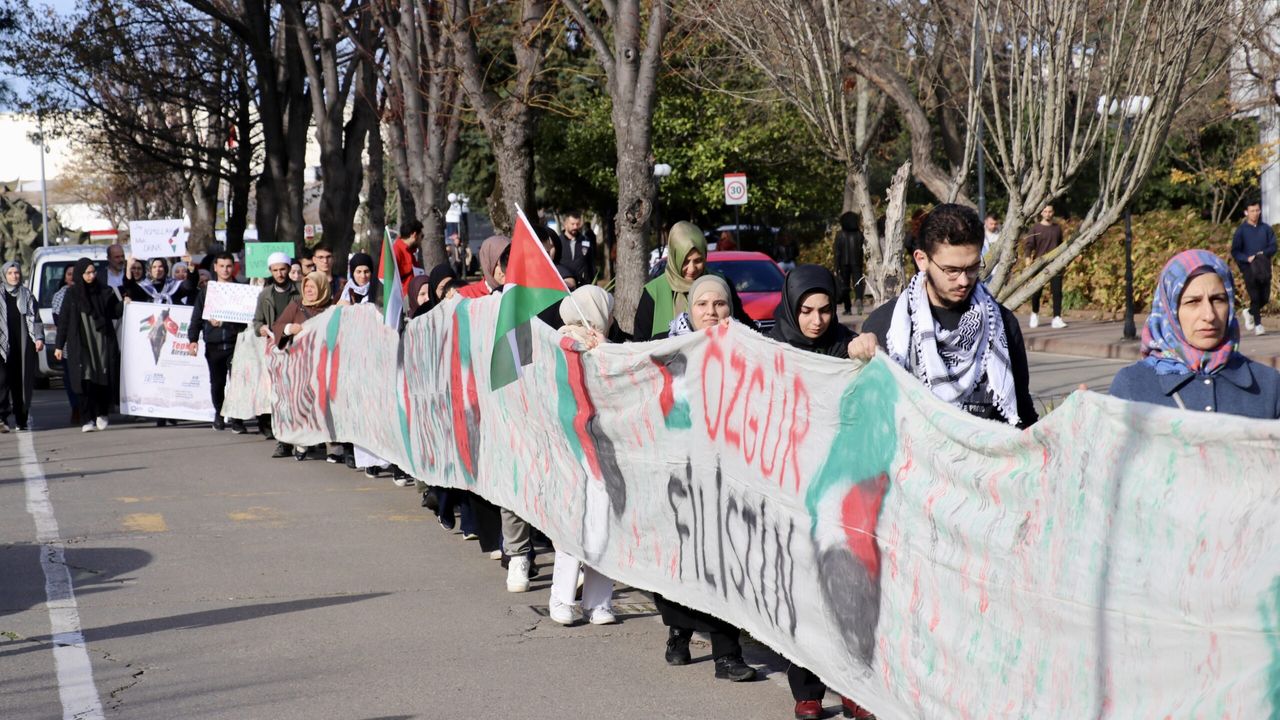 Grup, "Dünya Sessiz Çocuklar Ölüyor" ve "Özgür Filistin" yazılı pankartlarla kampüs içinde sessiz yürüyüş gerçekleştirdi.