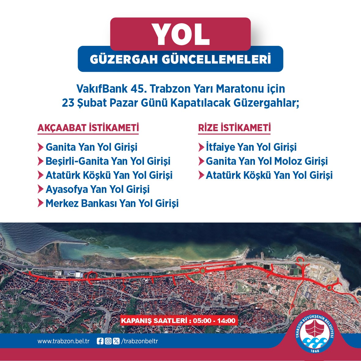Trabzon Büyükşehir Belediyesi’nin ev sahipliğinde, Valilik, Gençlik ve Spor İl Müdürlüğü ile Türkiye Atletizm Federasyonu'nun destekleriyle 23 Şubat Pazar günü gerçekleştirilecek olan VakıfBank 45. Uluslararası Trabzon Yarı Maratonu nedeniyle trafiğe kapatılacak yollar belirlendi. "Her Adımda Barışa Koş" mottosuyla düzenlenen yarı maraton için 23 Şubat Pazar günü sabah 05.00 ile 14.00 saatleri arasında, Akçaabat istikametinde Ganita, Beşirli-Ganita, Atatürk Köşkü, Ayasofya ve Merkez Bankası yan yol girişleri trafiğe kapalı olacak. Rize istikametinde ise Trabzon İtfaiyesi, Ganita ve Atatürk Köşkü yan yol girişleri kapatılacak.