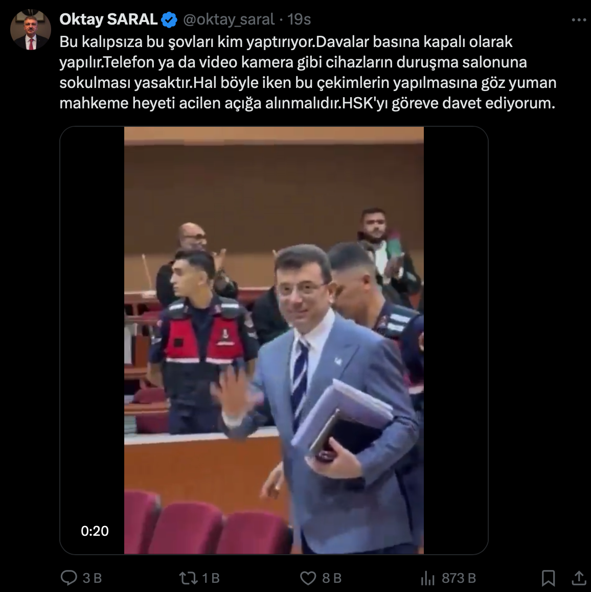 Cumhurbaşkanı Başdanışmanı Oktay Saral, İstanbul Büyükşehir Belediye Başkanı Ekrem İmamoğlu'nun "bilirkişi davası" kapsamında tutuklu olarak hakim karşısına çıktığı duruşmada çekilen görüntülere sert tepki gösterdi.