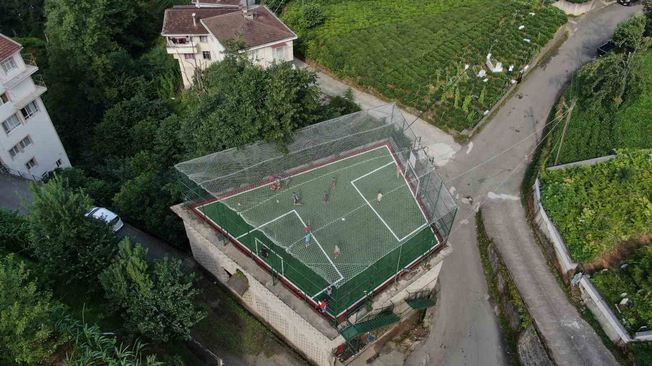 Trabzon’un Of ilçesindeki Ağaçseven Mahallesi’nde iki katlı çay alım merkezinin çatısına yaptırılan mini halı saha, gençlerin oyun alanı olu. Mahallede bulunan Kur’an kursuna giden öğrenciler, çıkışta vakitlerini halı sahada futbol oynayarak değerlendirirken, sahaya ait görseller sosyal medyada da ilgi görüyor.