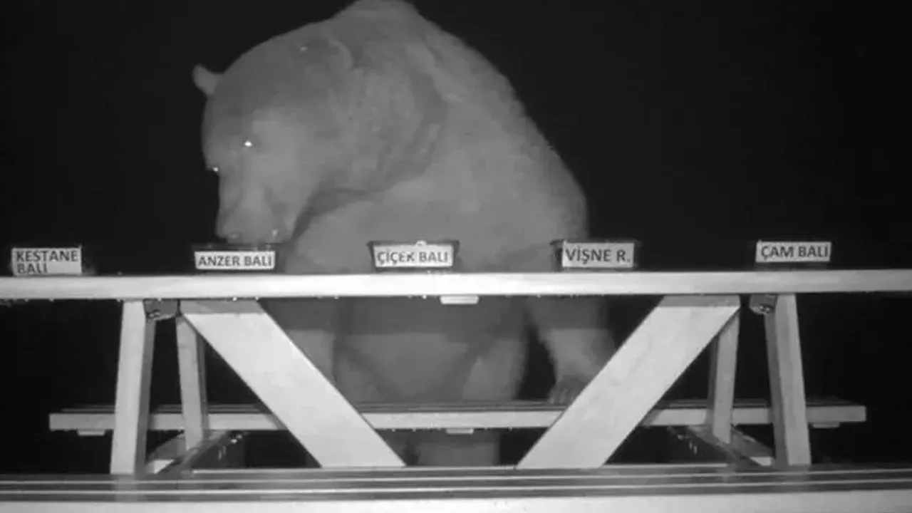 Daha sonra arı kovanlarına musallat olan ayıları teste tabi tutan Sedef, elinde bulunan 4 çeşit balın kalitesini ölçtürmek için açık alanda ayıya masa hazırladı.