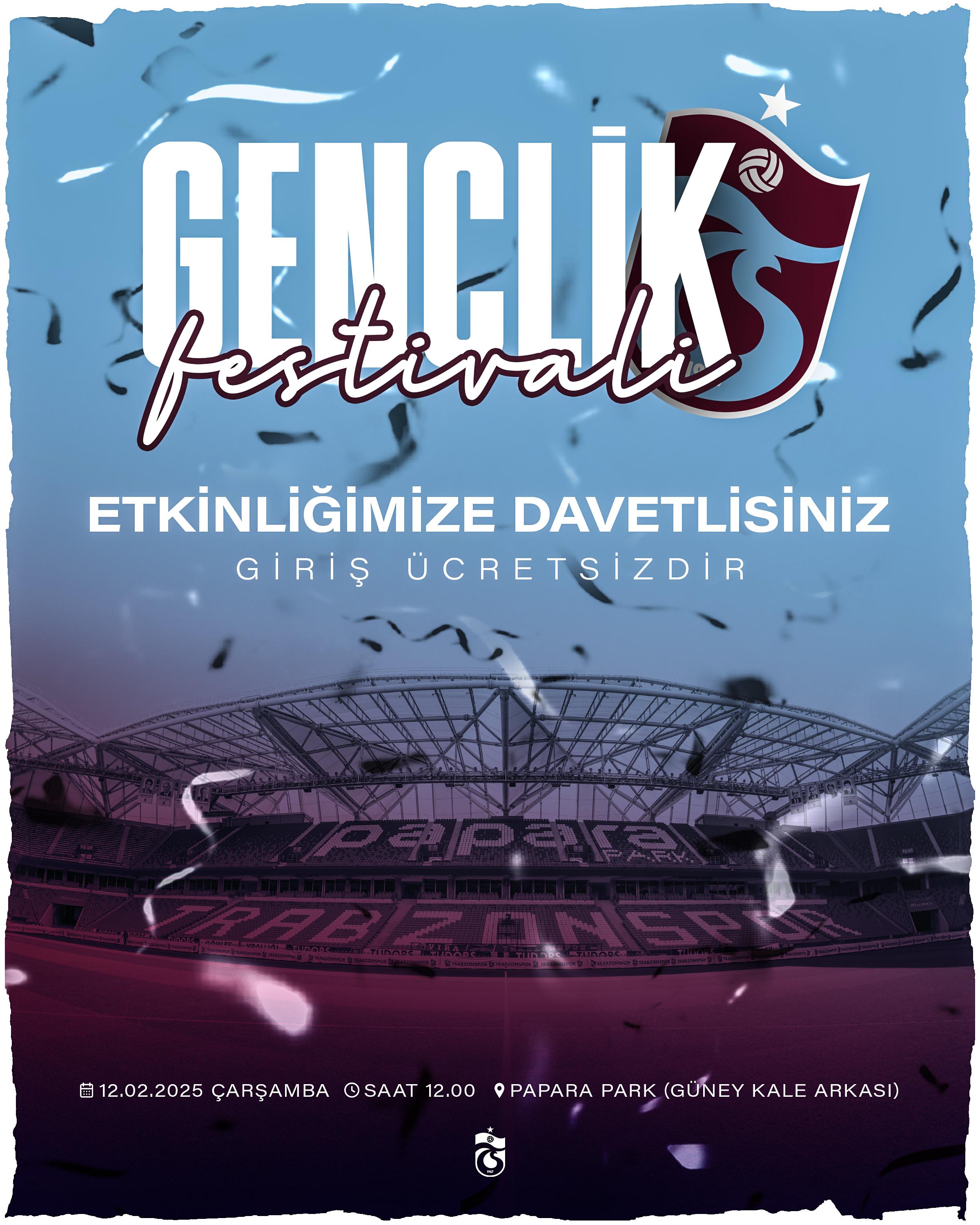 Trabzonspor'un Çarşamba günü (yarın) saat 18.00'da Papara Park'ta oynanacak olan Trabzonspor U19-Juventus U19 UEFA Gençlik Ligi maçı öncesi saat 14.00'da başlayıp maç sonrası saat 23.00'da sona erecek Gençlik Festivali etkinliklerine davetlisiniz. Etkinlik Papara Park'ın Güney dış alanında yapılacak.