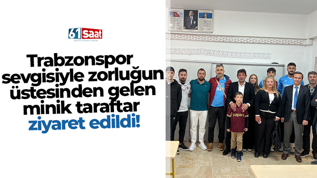 61SAAT'in gündeme getirdiği olaya duyarsız kalmayan Trabzonlular Federasyonu Başkanı İsmail Turgut Öksüz ve Üni TS ekibi, İstanbul Bakırköy İbni Sina İlköğretim Okulu’nda eğitim gören 8 yaşındaki Trabzonspor sevdalısı Kürşat Eren Öztürk’ü okulunda ziyaret etti.