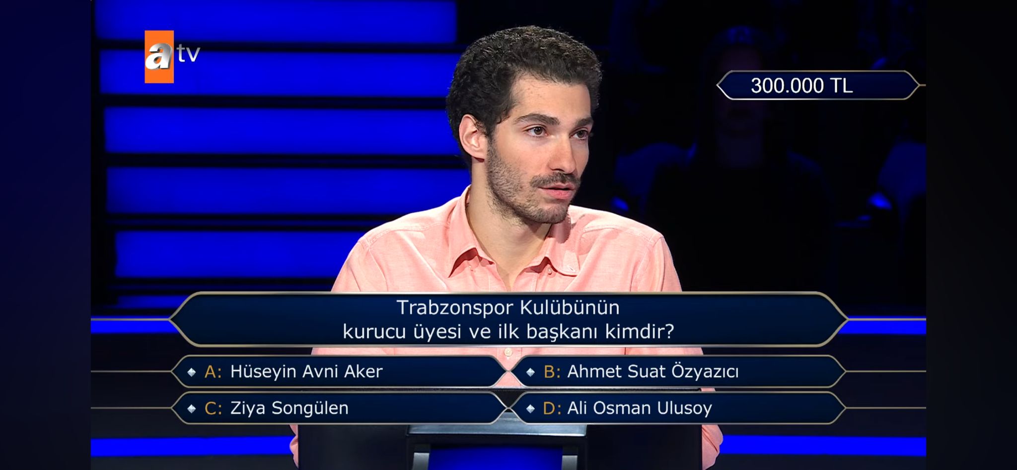 Yarışmacıya 300.000 TL değerindeki soruda, “Trabzonspor Kulübü’nün kurucu üyesi ve ilk başkanı kimdir?” sorusu yöneltildi. Ancak yarışmacı doğru cevabı veremedi ve bu kritik soruda yarışmadan elendi.
