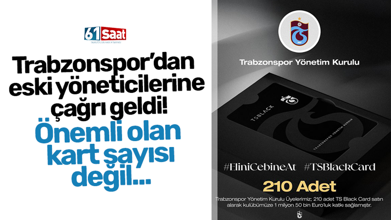 Trabzonspor’dan yapılan açıklamada, "Trabzonspor’umuzun tarihine yön vermiş, alın teri, emeği ve vizyonuyla kulübümüze değer katmış sizleri, bugün bir kez daha yanımızda olmaya davet ediyoruz. TS Black Card kampanyamız, yalnızca bir kart projesi değil; Trabzonspor’un geleceğine uzanan güçlü bir dayanışma köprüsüdür. Bu köprü, sizlerin geçmişte olduğu gibi bugün de göstereceği destekle daha da sağlamlaşacaktır. Bu kampanyada önemli olan, alınan kart sayısı değil; bu armaya, bu renklere ve bu şehre duyulan sadakat ve vefadır. Bir kart alan da, yüz kart alan da aynıdır... Hedefimiz, 10 bin rakamına hep birlikte ulaşmak. Bu hedefe ulaşmamızda, Trabzonspor’un geçmişinde iz bırakmış değerli yöneticilerimizin desteği, bizim için çok büyük bir anlam taşımaktadır. Gelin, geçmişte omuz omuza verdiğimiz mücadeleyi bugün de sürdürelim; Bordo-Mavi sevdamızı, gelecek nesillere daha güçlü bir miras olarak bırakalım" ifadesi kullanıld.
