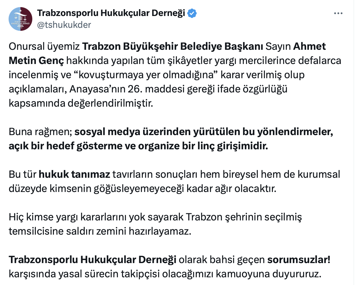 Onursal üyemiz Trabzon Büyükşehir Belediye Başkanı Sayın Ahmet Metin Genç hakkında yapılan tüm şikâyetler yargı mercilerince defalarca incelenmiş ve “kovuşturmaya yer olmadığına” karar verilmiş olup açıklamaları, Anayasa’nın 26. maddesi gereği ifade özgürlüğü kapsamında değerlendirilmiştir.