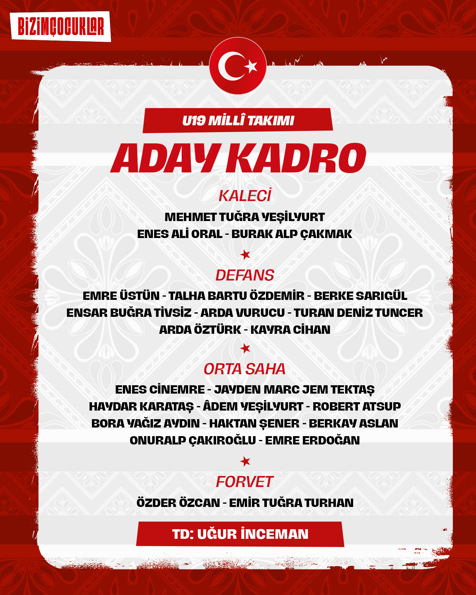 U19 Milli Takım’ın UEFA Avrupa U19 Şampiyonası Elit Tur maçları hazırlıkları kapsamında 11-14 Ocak tarihlerinde Özbekistan ile Antalya'da oynayacağı özel maçların aday kadrosu açıklandı. Trabzonspor forması giyen Arda Öztürk, Onuralp Çakıroğlu ve Turan Deniz Tuncer aday kadrodan davet aldı. Öte yandan bordo mavili takımın transfer listesinde yer alan Adem Yeşilyurt kadroda yer alan bir diğer isim oldu.