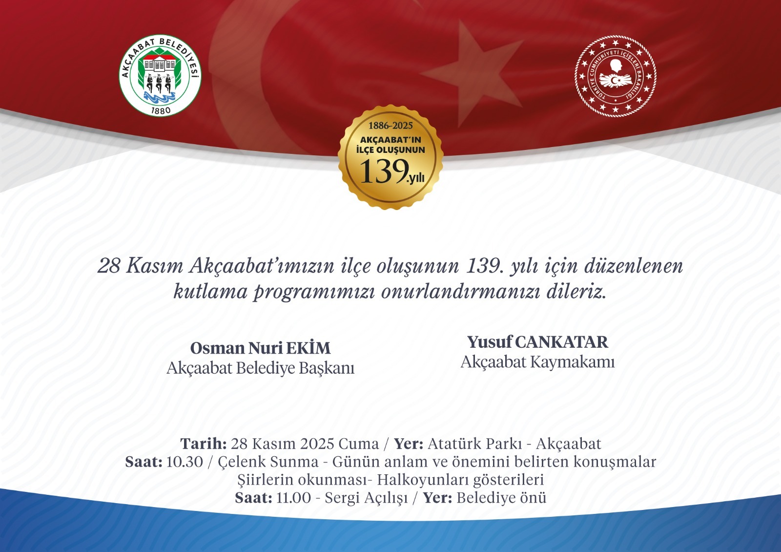 Akçaabat’ın ilçe oluşunun 139. yılı, Akçaabat Belediyesi tarafından düzenlenecek bir dizi etkinlikle kutlanacak. 1886 yılında ilçe statüsüne kavuşan Akçaabat, tarihiyle, kültürüyle ve insanıyla bölgenin en köklü yerleşimlerinden biri olarak, geçmişinden aldığı ilhamla geleceğe yürümeye devam ediyor.
