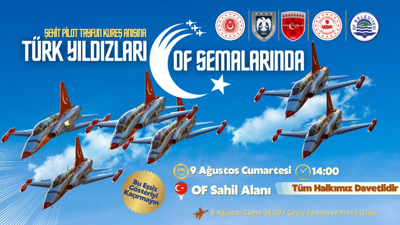 9 Ağustos 2025 tarihinde Of'ta, hem onur hem de duygusal bir ana tanıklık edecek. Türk Hava Kuvvetleri'nin gururu olan Türk Yıldızları, Oflu Şehit Kurmay Pilot Yüzbaşı Tayfun Kureş'in anısına özel bir gösteri uçuşu gerçekleştirecek. Etkinlik, Of Belediyesi ve Of Kaymakamlığı'nın katkılarıyla düzenlenecek ve saat 14.00'te Of sahili boyunca izlenebilecek.