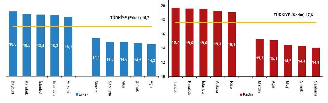 Kadınlar için 17,6 yıl olan muhtemel eğitim süresi, erkeklerde 16,7 yıl olarak kaydedildi. Erkeklerde en yüksek MES Bayburt’ta, kadınlarda ise Tunceli’de görüldü. Erkeklerde Bayburt’u Karabük, İstanbul, Erzincan ve Ankara izlerken, kadınlarda Tunceli’yi Karabük, İstanbul, Ankara ve Rize takip etti.