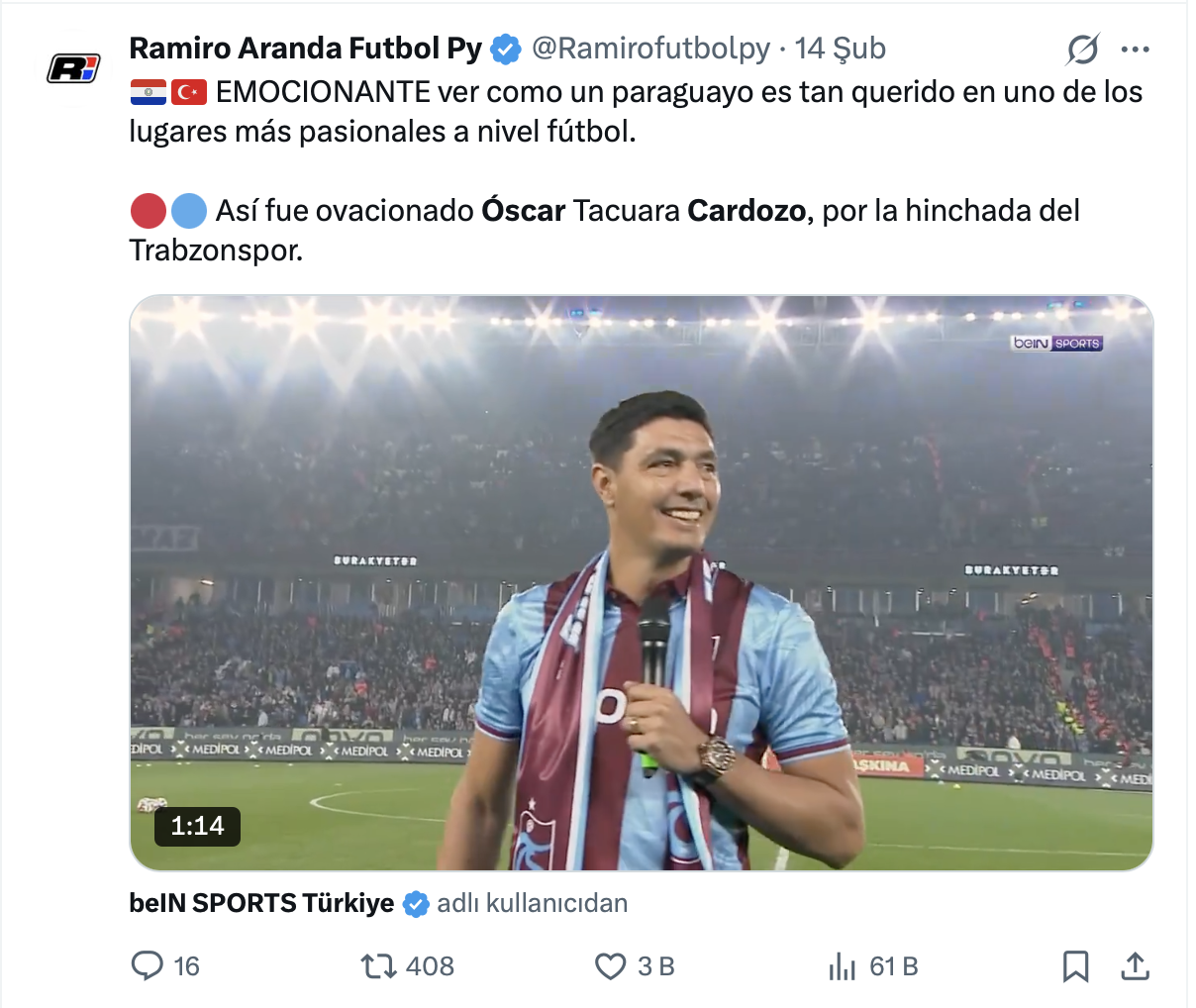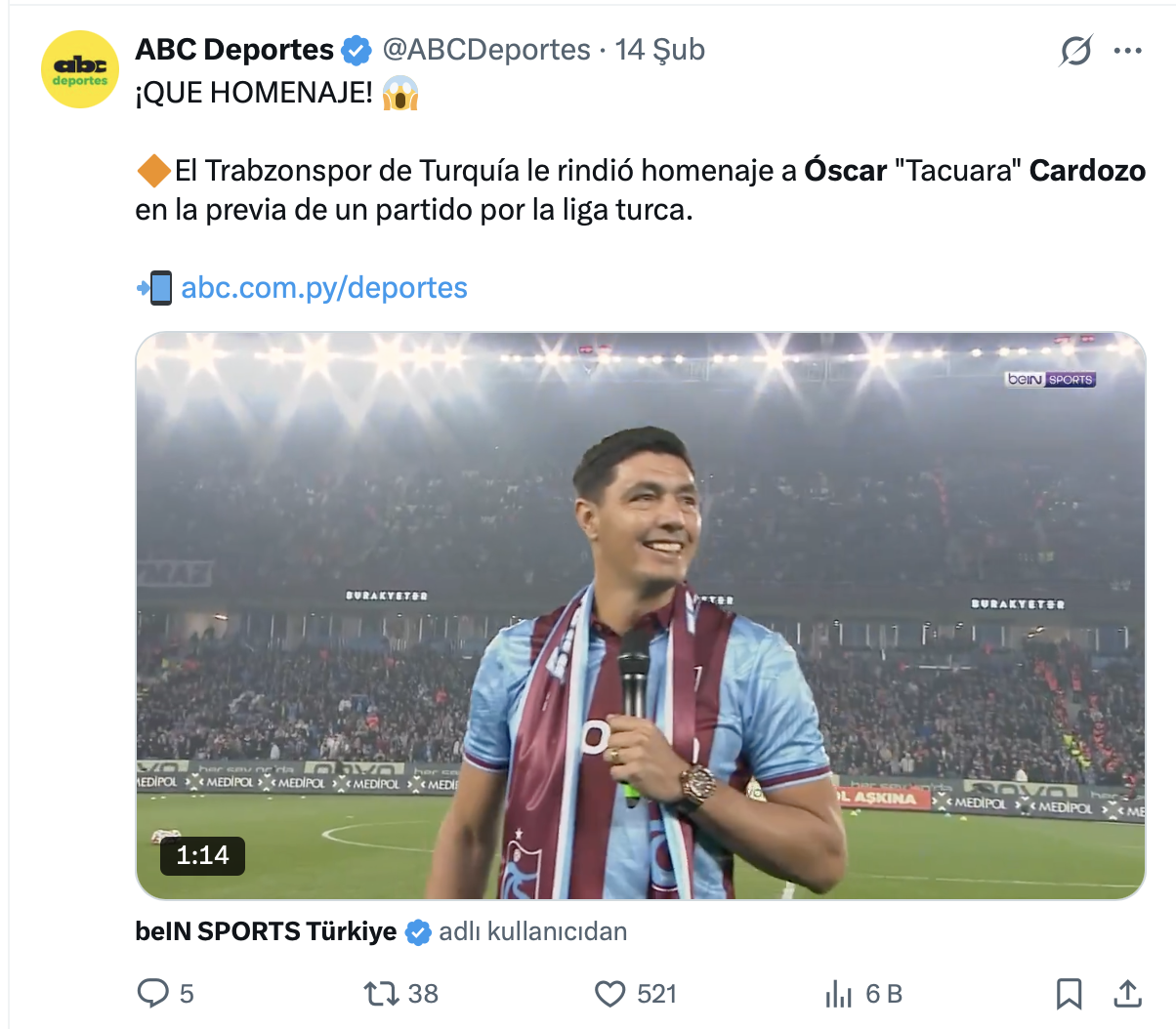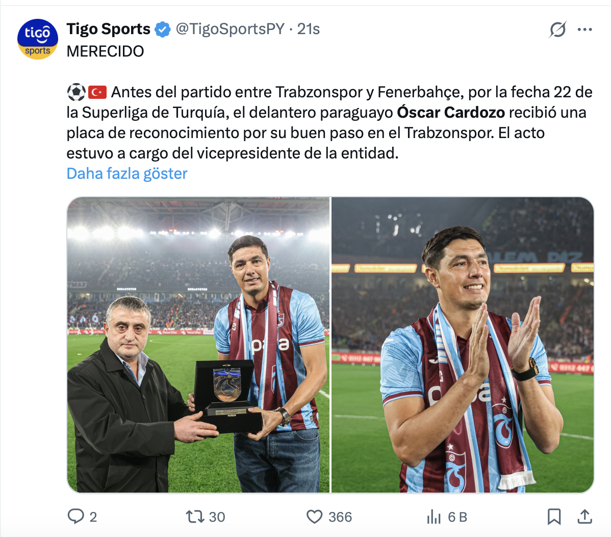 Trabzonspor'un eski futbolcusu Oscar Cardozo, Fenerbahçe karşılaşması öncesinde teşekkür plaketi ile ödüllendirildi. Trabzonspor Başkan Yardımcısı Serkan Kılıç'ın tarafından takdim edilen plaket ile Cardozo onurlandırıldı. Tribünlerin alkışları eşliğinde gerçekleşen takdimde büyük mutluluk duyduğunu ifade eden Cardozo, Trabzonspor Başkan Yardımcısı Serkan Kılıç’a teşekkür ederek taraftarları selamladı. O anlar yalnızca Türkiye'de değil dünya basınında da geniş yer buldu. Trabzonspor'un Cardozo'ya vefasını manşetlerine taşıyan yabancı basın yıldız forvetten ise 'Efsane' olarak bahsedildi.