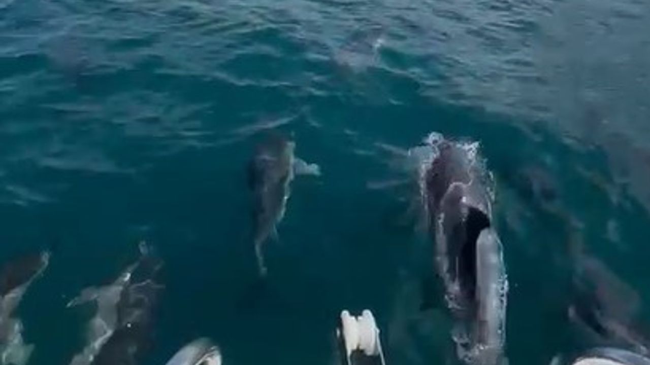Giresun’da tekne ile Giresun Adası’na doğru yola çıkan bir grup genç yunusların kendilerine yaptığı süprizle karşılaştı. Sayıları 15-20 taneyi bulan yunus sürüsü tekneye Giresun Adası’na kadar eşlik ederken, o anlar teknedekiler tarafından cep telefonu ile kaydedildi.