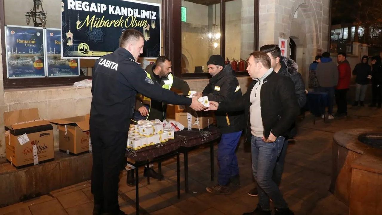 ÜÇ AYLARIN GELMESİ, MANEVİ İKLİMİN DALGA DALGA YAYILMAYA BİRLİKTE İDRAK EDİLEN REGAİB KANDİLİNDE TÜM YURTTA OLDUĞU GİBİ BAYBURT’TA DA CAMİLER DOLDU. BAYBURT BELEDİYESİ ZABITA MÜDÜRLÜĞÜ EKİPLERİ DE KANDİL SİMİDİ GELENEĞİNİ DEVAM ETTİRDİ, CAMİDEN ÇIKAN CEMAATE KANDİL SİMİDİ İKRAMINDA BULUNDU