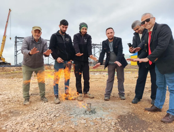 Bursa'nın Karacabey ilçesi Uluabat köyü Aktaş mevkiinde bulunan bir ketçap fabrikasının depo kısmında zemin etüdü yapan kepçe operatörü Emrah Us, yaklaşık 20 metre kazı yaptıktan sonra suyla karışık gaz çıktığını fark etti.