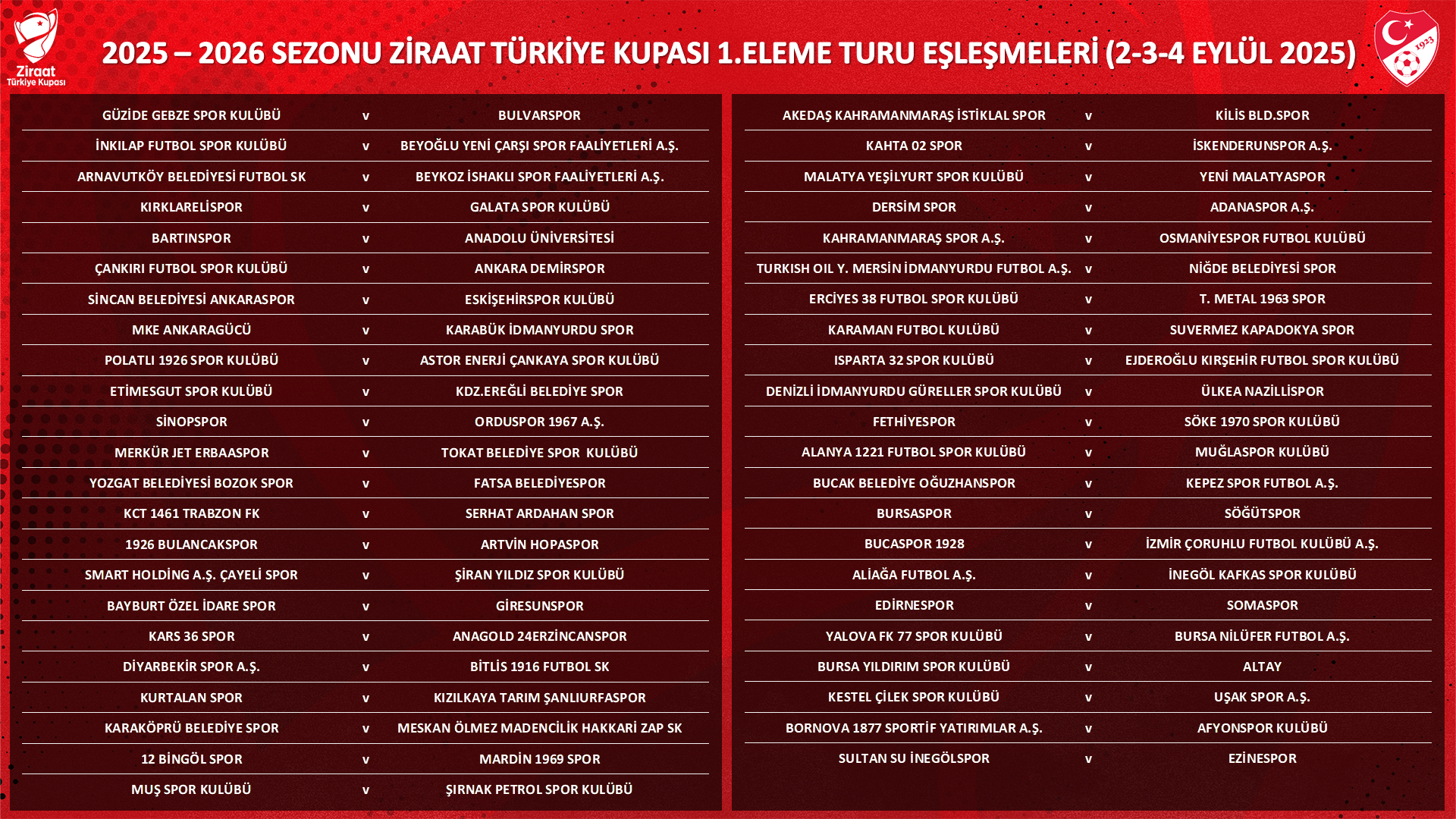 Ziraat Türkiye Kupası 1. Eleme Turu eşleşmeleri şu şekilde oldu: